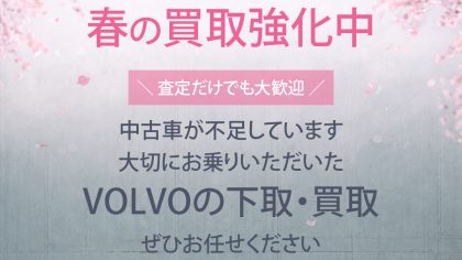 現在、中古車が不足しております。大切にお乗りいただいたボルボを、ぜひお譲りください。ただいま下取り・買取ともに強化中です✨ 査定は無料ですので、まずはお気軽にご相談ください。「今いくらくらい?」というご相談だけでも大歓迎です。 ...
